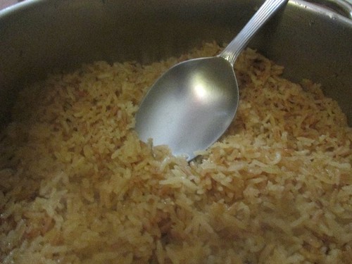 Continuando... Em lume brando, deixe o arroz ganhar uma tonalidade dourada, sempre com o cuidado de o ir mexendo para que a cebola e/ou o alho não se queimem. Quando o arroz alcançar essa cor, acrescente a água (de preferência bem quente) e tempere de sal. Vai borbulhar, mal deite a primeira chávena de água. Mexa. Tape e coloque o lume médio para o alto. Passados 5 minutos, reduza um pouco o lume. Deixe cozinhar até o líquido se evaporar e ele estar cozido mas soltinho. No fim, depois do lume desligado, deixe repousar uns minutinhos.