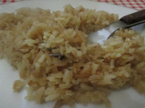 Na verdade, é um arroz frito. Sabe quase a arroz de forno. É super soltinho, uma maravilha.