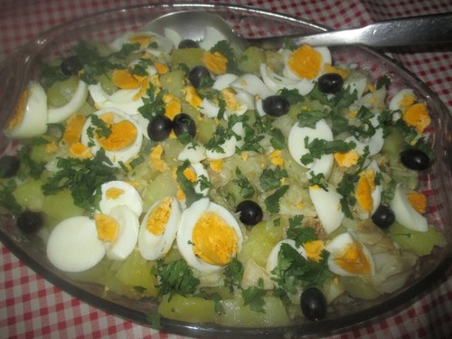 Numa travessa ou pirex de servir, junto as batatas, o bacalhau, o azeite com as cebolas e alho e envolvo tudo. Corto rodelas de ovo cozido que disponho por cima, a enfeitar e polvilho com abundantes coentros frescos picados. Decoro com azeitonas pretas ou levo uma tacinha com as ditas a acompanhar para a mesa...