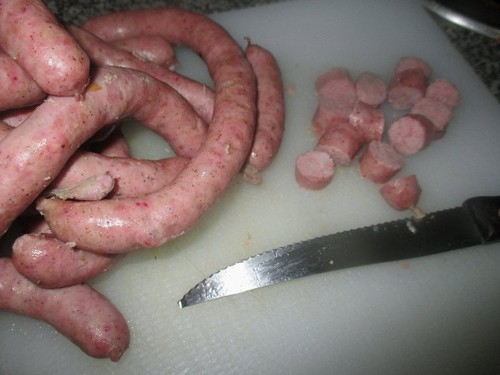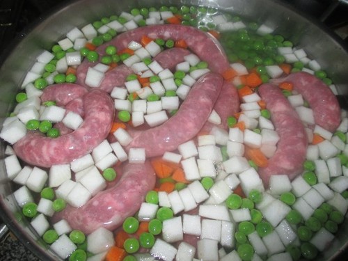12 salsichas frescas (uso umas do meu talho que têm pouquíssima gordura, aliás, de outra forma não gostaria delas)