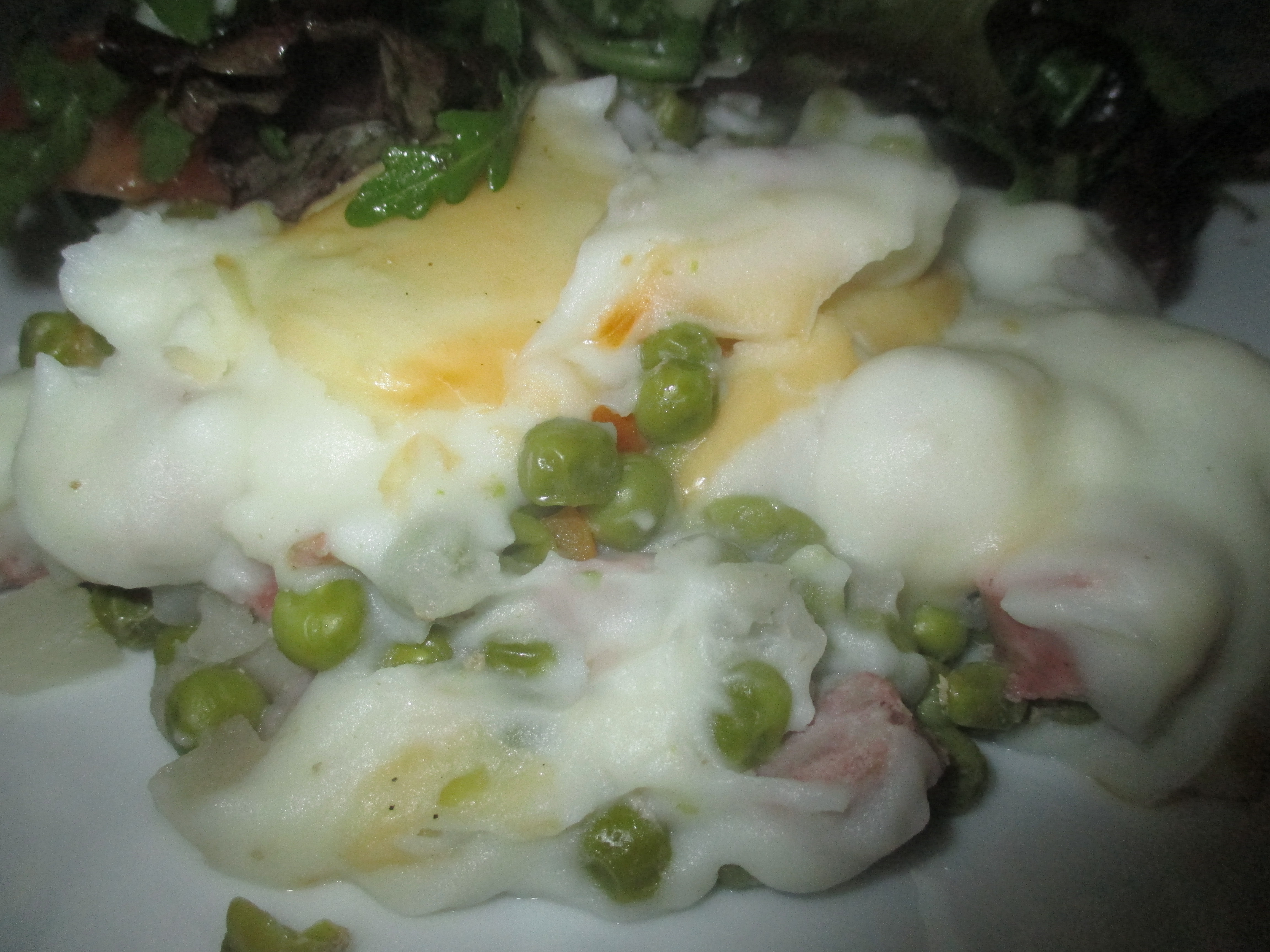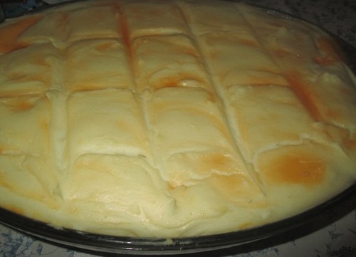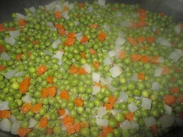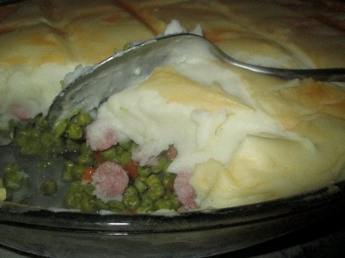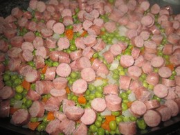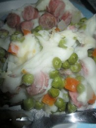 Primeiro, descasquei o nabo e parti-o em cubos pequeninos. Descasquei as cenouras e cortei-as, igualmente, em cubos pequeninos. Coloquei o nabo e a cenoura, juntamente com as ervilhas e as salsichas, numa panela com água e sal e levei tudo a cozer. Assim que as salsichas estejam cozidas, retire-as, escorra-as e corte-as às rodelas (não muito grossas nem muito finas). Reserve. Depois, verifique se os legumes tabém estão cozidos (não os deixe empapar) e se "sim" retire-os, escorra-os muito bem. E forre com os legumes o fundo do pirex grande que irá levar ao forno. Tente que fiquem bem distribuídos. De seguida, disponha por cima dos legumes as rodelas de salsichas. Cubra com o puré que fez. Pincele com o ovo e leve ao forno só para gratinar. Acompanhe com salada!