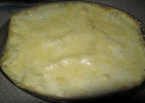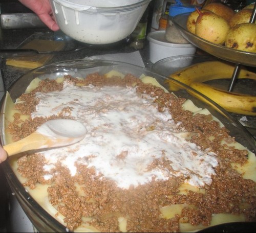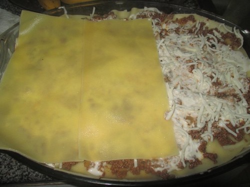 Com a ajuda de uma escumadeira, disponha uma camada de carne bem escorrida (livre de molho). O meu pirex é alto e eu decidi fazer três camadas, portanto, a olho, usei um terço da carne. E assim fiz com todos os ingredientes (tirei-lhes as medidas, ah ah). Depois, por cima, espalhei bechamel e polvilhei com o queijo (ver as fotos abaixo). Voltei a a cobrir com folhas de lasanha cozidas e a seguir o processo por aquela ordem (folhas de lasanha, carne, bechamel e queijo). Assim sucessivamente, até acabar. No fim, termina-se com camada de lasanha, (já sem a carne) bechamel e bastante queijo (mais do que nas camadas anteriores). Leva-se ao forno a gratinar.
