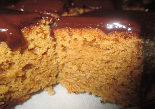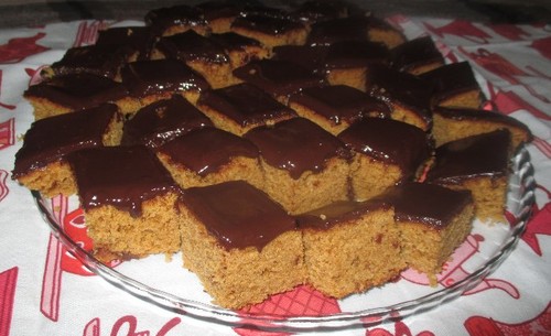Basta partir o chocolate aos quadradinhos e juntamente com um pouco de natas (ou leite, se preferir), levar a derreter em lume brando. Vá mexendo. Assim que esteja derretido, brilhante, retire do lume. Deixe amornar um pouquinho (uns 3 minutos) e verta (ainda quente) sobre o bolo. Barre toda a superfície do topo com a ajuda de uma espátula. Deixe arrefecer para que solidifique. Só, após isso, deverá cortar os quadrados com uma faca. faça-o com algum cuidado, para que o chocolate não se espalhe (apesar dele estar semi-sólido).