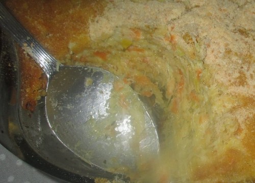 Arranje o feijão verde (lavando e cortando as pontas fora). Corte-o em 2 ou 3 filas no sentido longitudinal (ao alto). Arranje as cenouras, descascando-as, lavando-as e cortando-as às tiras. De seguida, coza o feijão verde e as cenouras em água com sal. Escorra e forre com estes legumes (bem misturados) o fundo de um pirex grande.