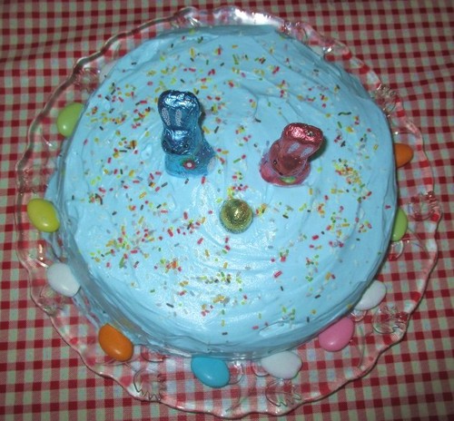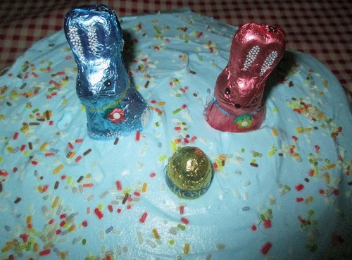 Depois, a decoração, foi simples e de acordo com a temática da Páscoa: 2 coelhinhos e 1 ovinho... e um granulado colorido para animar.