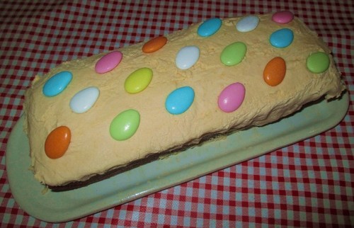 Cobri com aquele falso doce de ovos (que já me arrependi, mas para a próxima, sem ser época de Páscoa, irei cobri-lo com um doce de ovos como deve de ser, hehe) e enfeitei com amêndoas (daquelas recheadas com chocolate).