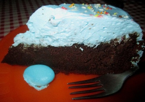 Esta é uma receita diferente de bolo de chocolate. Muito boa. Embora, desta vez a tenha alterado um pouco para que o bolo ficasse mais "firme", uma vez que o queria decorar com chantilly... Alterei-a adicionando um pouquinho mais de farinha e tendo deixado o bolo cozer mais tempo... Porque a receita original dele deixa-o mais tipo mousse. Um dia destes, coloco-a aqui. Mas o que importava era o sabor intenso que ele tem. Até porque usei um chantilly muito pouco doce...