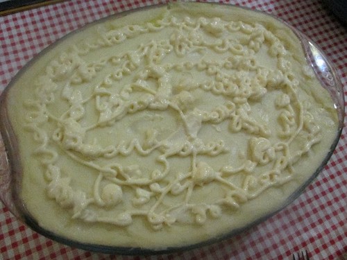 Por fim, cubra com o puré. Pincele com ovo e leve ao forno a gratinar.
