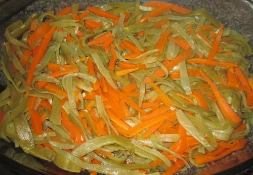 Arranje o feijão verde (lavando e cortando as pontas fora). Corte-o em 2 ou 3 filas no sentido longitudinal (ao alto). Arranje as cenouras, descascando-as, lavando-as e cortando-as às tiras. De seguida, coza o feijão verde e as cenouras em água com sal. Escorra e forre com estes legumes (bem misturados) o fundo de um pirex grande.