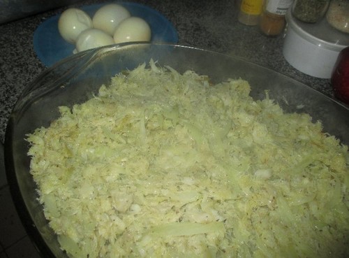 Depois, pique pos alhos e corte a cebola em meias luas e leve-os a alourar numa frigideira com azeite. Acrescente-lhe o bacalhau em lascas e envolva bem. Deixe alourar. Se quiser pode temperar com um pouco de sal e pimenta. Atenção à quantidade de azeite, o ideal é que o preparado não esteja seco mas também que não tenha demasiado azeite. Digamos, que deve conseguir ver azeite se afastar com um garfo ou colher de pau o bacalhau, mas só isso.