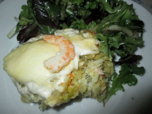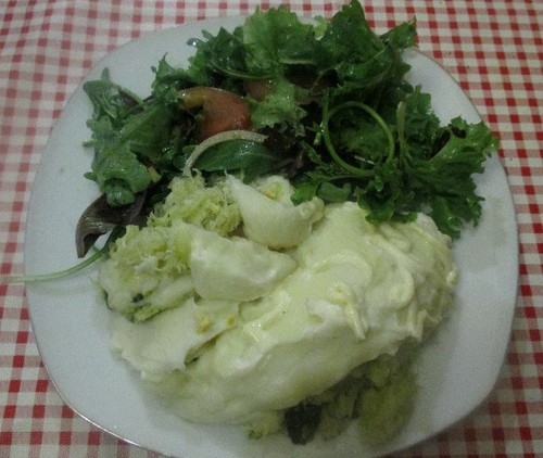 Faça o puré. Gosto de fazer com o instantâneo, além de ser mais rápido, se for para guardar restos, aguenta melhor. Assim, para fazer os 300 gr de puré usei o leite e a água indicados na embalagem, 2 colheres de café de sal e 1 colher de sopa de manteiga. Se quiserem fazer puré verdadeiro, cozam cerca de 8 batatas jeitosas em água e sal, passem no passe vite e juntem leite por forma a obterem um puré cremoso mas não demasiado líquido e temperem com a colher de sopa de manteiga. Reservem o puré.