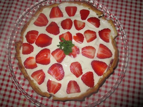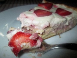 Eu disse que andava muito amiguinha dos morangos:) Porém, fiz algo que nunca tinha feito: uma tarte com morangos! Bolos com morangos tudo bem, mas tartes... Bem, tartes de maçã, de requeijão... Quando a tarte é de fruta a minha predilecta é a de maçã. Contudo, já tinha feito bolo holandês de morango há pouco tempo... e esse voou num ápice... E tinha morangos... Ok, vamos lá magicar algo. E saiu esta tarte cujo sabor é leve, fresco, não demasiado doce mas doce q.b.. Agradou a todos e acho que é uma óptima sobremesa de Verão. Tarte de frutas com 2 recheios. Desta vez foi de morangos, para uma próxima quem sabe?! :)