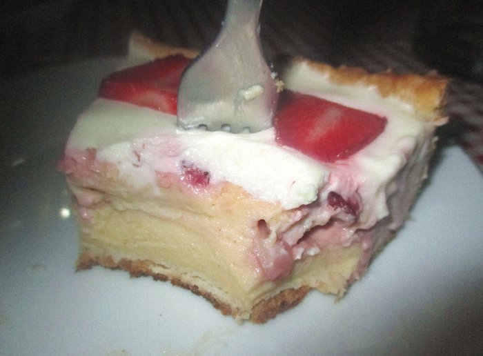 Fazer o 1º recheio: levar o leite a levantar fervura. À parte, numa tigela, bater os ovos e as gemas com o açúcar, a farinha e a pitada de canela. Depois, misturar bem no leite. Juntar a manteiga e voltar a ligar o lume (brando), não parar de mexer até engrossar mas ficar sem grumos. Quando o creme estiver homogéneo e grossinho, retirar do lume. Deixar arrefecer. Verter metade sobre a massa da tarteira. Polvilhar abundantemente com morangos picados. Verter o restante por cima. Levar ao forno.